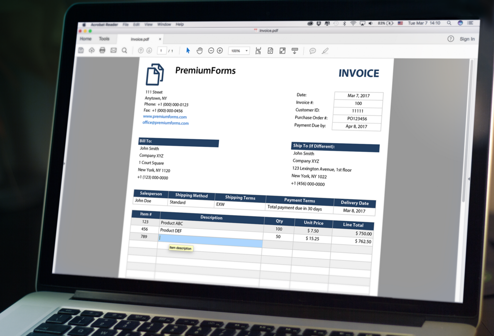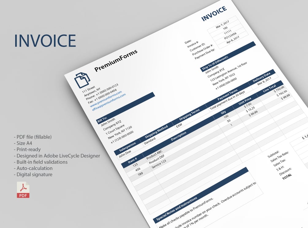 Use this Invoice for personal, corporate or company billing purpose. This Smart PDF Invoice will help you to create your invoice very quick and easy using free Adobe Reader. Due to its intuitive features, built-in validations and auto calculation it is easily prepared. Professional invoice look will convey your brand identity as well.
